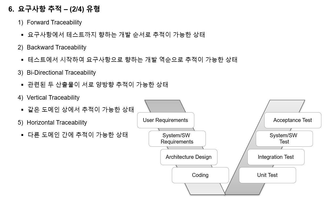 시스템 레벨에서는 소프트웨어에서 요구사항과 연결, 소프트웨어는 반대로 시스템 요구사항과 연결 양방향 추적성을 통해서 어떤 요구사항이든지 상위/하위 상관관계를 확인할 수 있어야 한다.